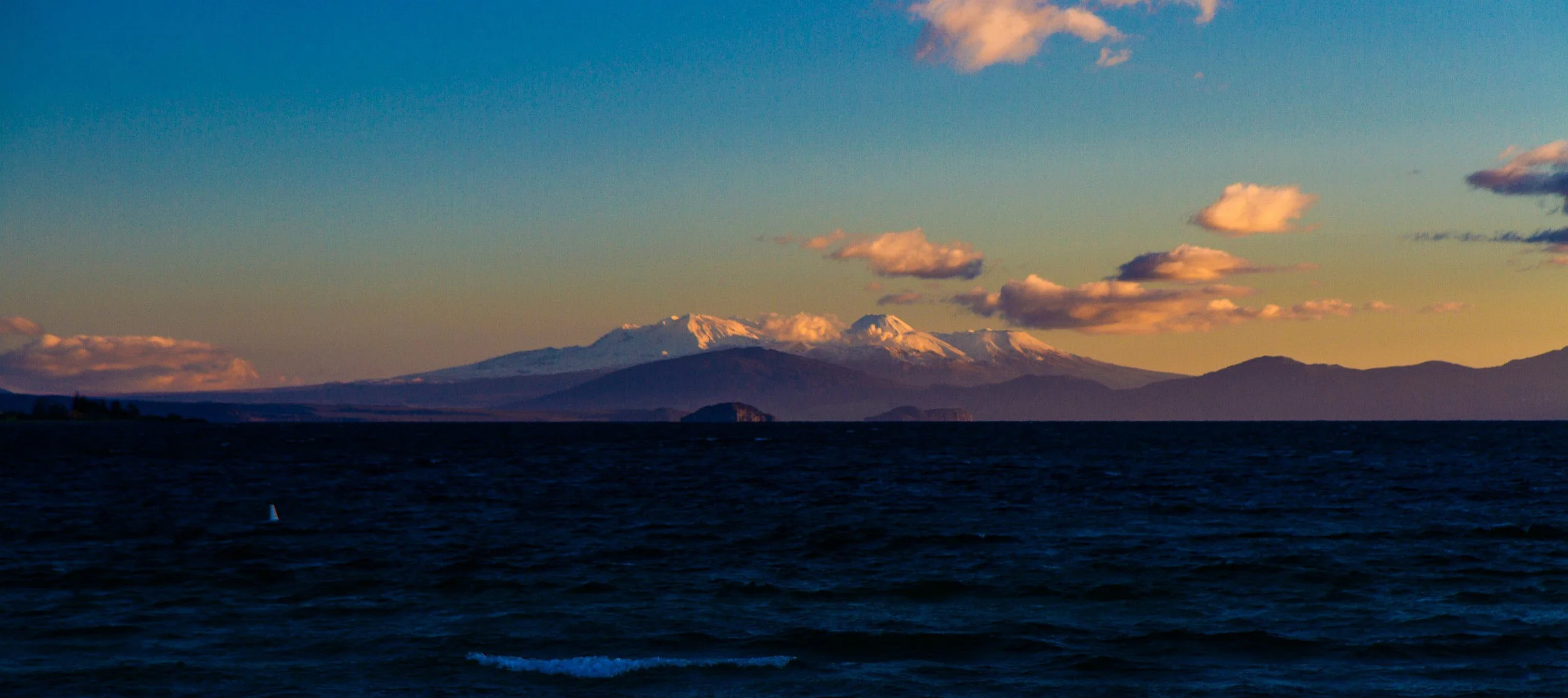 Taupo is approximately a 4-hour drive from Auckland. You may decide to have an early morning start, and stop along the way at numerous stops in order to get some rest as well as some food as you make your way down. On your way to Taupo, you will cross the city of Hamilton, which is roughly an hour and a half to two hours drive from Auckland, depending on where you’re driving from. If you don’t plan on coming back to Auckland after your trip to Taupo, I recommend you stop at Hamilton, more specifically at the Hamilton Gardens for a break. The Hamilton Gardens is a vast garden space that showcases flora and fauna of the world creating a mirage of being in that particular location. It has a section on Japanese Gardens, Indian Gardens and much more. Once you’ve left Hamilton Gardens and are headed for Taupo, it should be roughly 2 hours before you reach. Even though Taupo doesn’t necessarily have a lot of activities to do in the span of 3-4 days, the reason I suggest a stay of this duration is so that you can spend ample time by the lake without having to worry about losing out time on doing other things. By the time you arrive in Taupo, it will most likely be late afternoon, early evening. At this point you have two choices. Either you settle in to your room wherever you’re staying, or you check-in and possibly stroll by the lake. On a nice clear day you can even see Mt. Ruapehu across the lake.